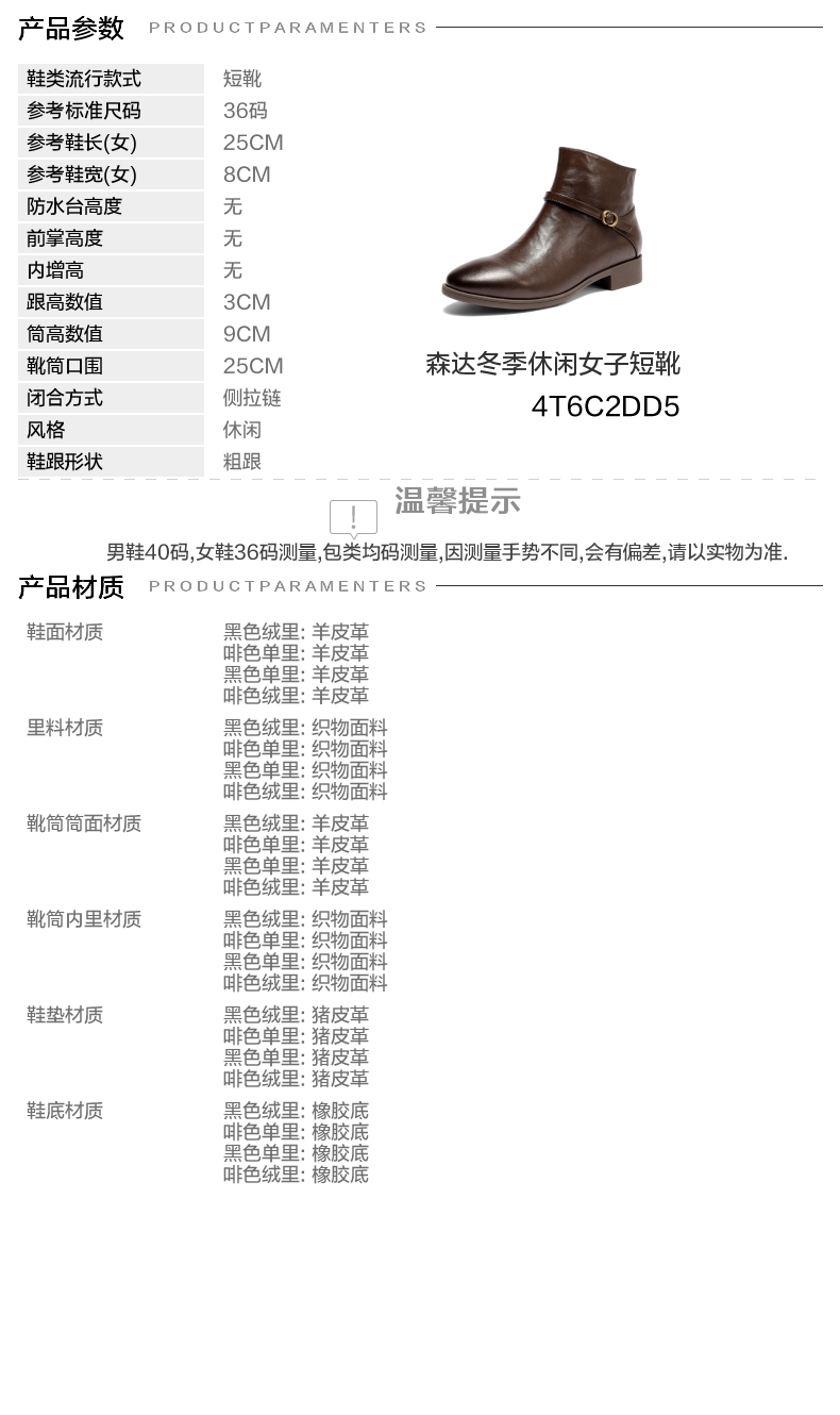 鞋底材质:橡胶底 靴筒内里材质:织物面料 内增高:无 鞋面材质:羊皮革 闭合方式:侧拉链
