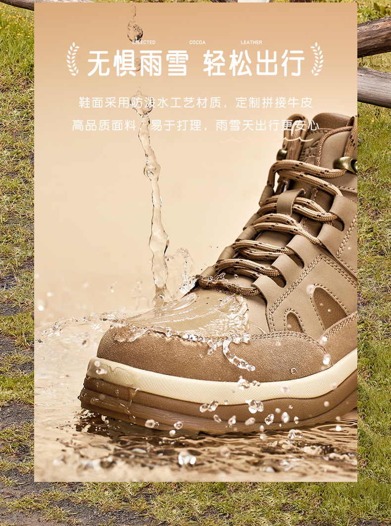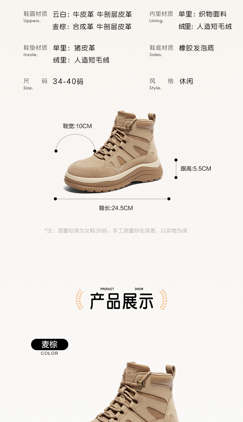 | 鞋底材质:橡胶发泡底 | 靴筒内里材质:人造短毛绒 | 内增高:无 | 鞋面材质:牛剖层皮革合成革 | 适用场合:日常休闲 |