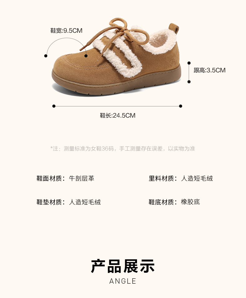 | 参考标准尺码:36码 | 跟高数值:3.5CM | 性别:女子 | 里料材质:人造短毛绒 | 制鞋工艺:胶贴皮鞋 |