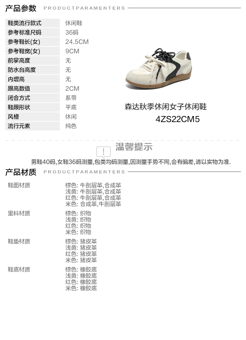 | 鞋帮:低帮 | 鞋底材质:橡胶底 | 内增高:无 | 鞋面材质:牛剖层革合成革 | 闭合方式:系带 |