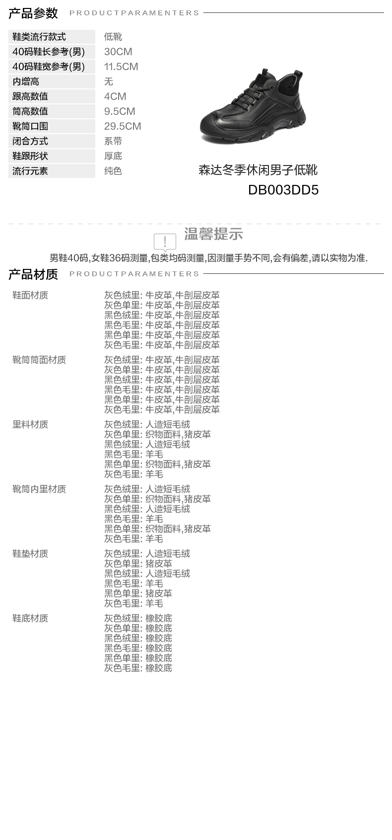 | 闭合方式:系带 | 40码鞋宽参考(男):11.5CM | 靴筒口围:29.5CM | 上市时间:2025年冬季 | 鞋类流行款式:低靴 |