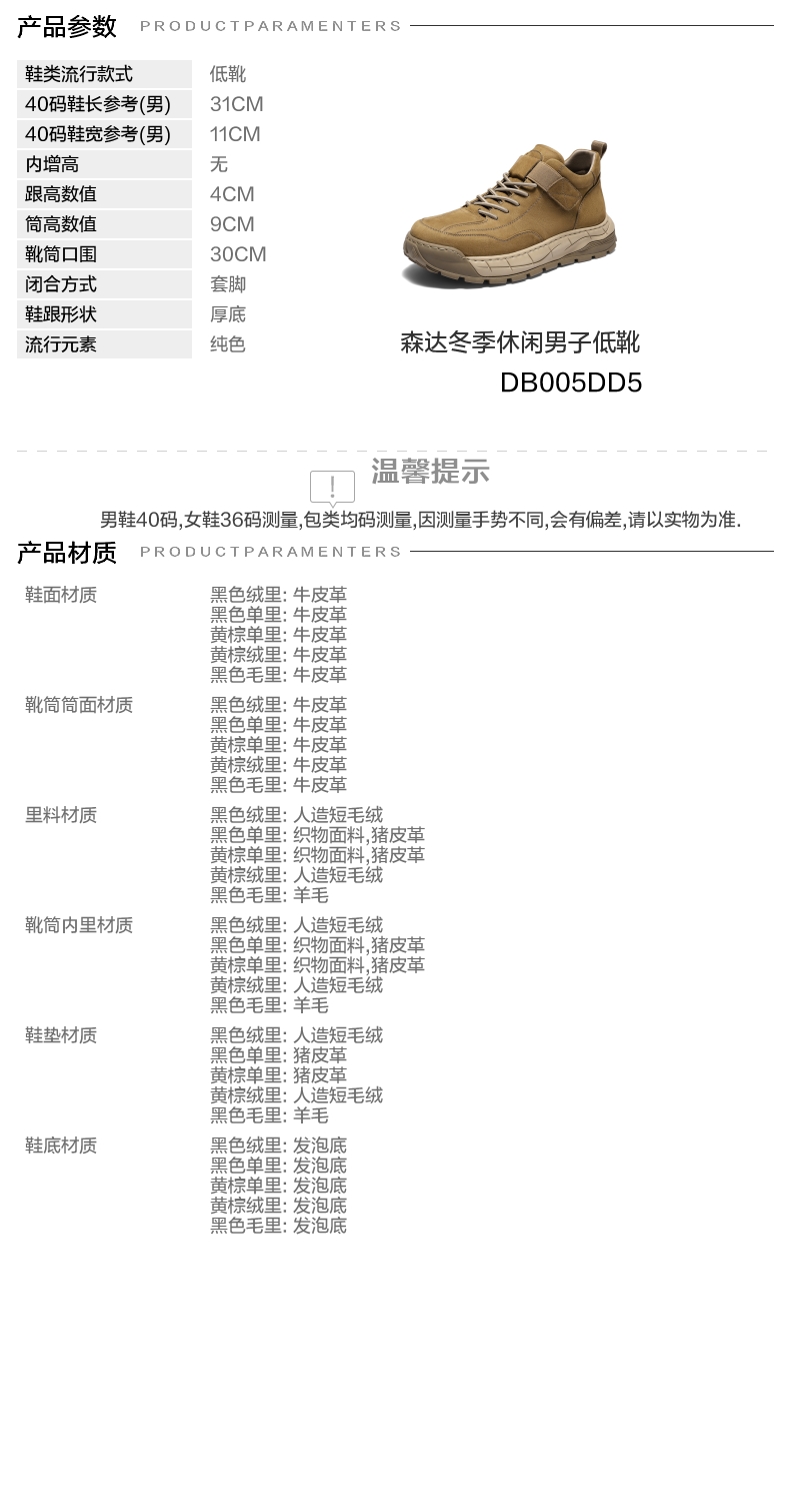 | 闭合方式:套脚 | 40码鞋宽参考(男):11CM | 靴筒口围:30CM | 上市时间:2025年冬季 | 鞋类流行款式:低靴 |