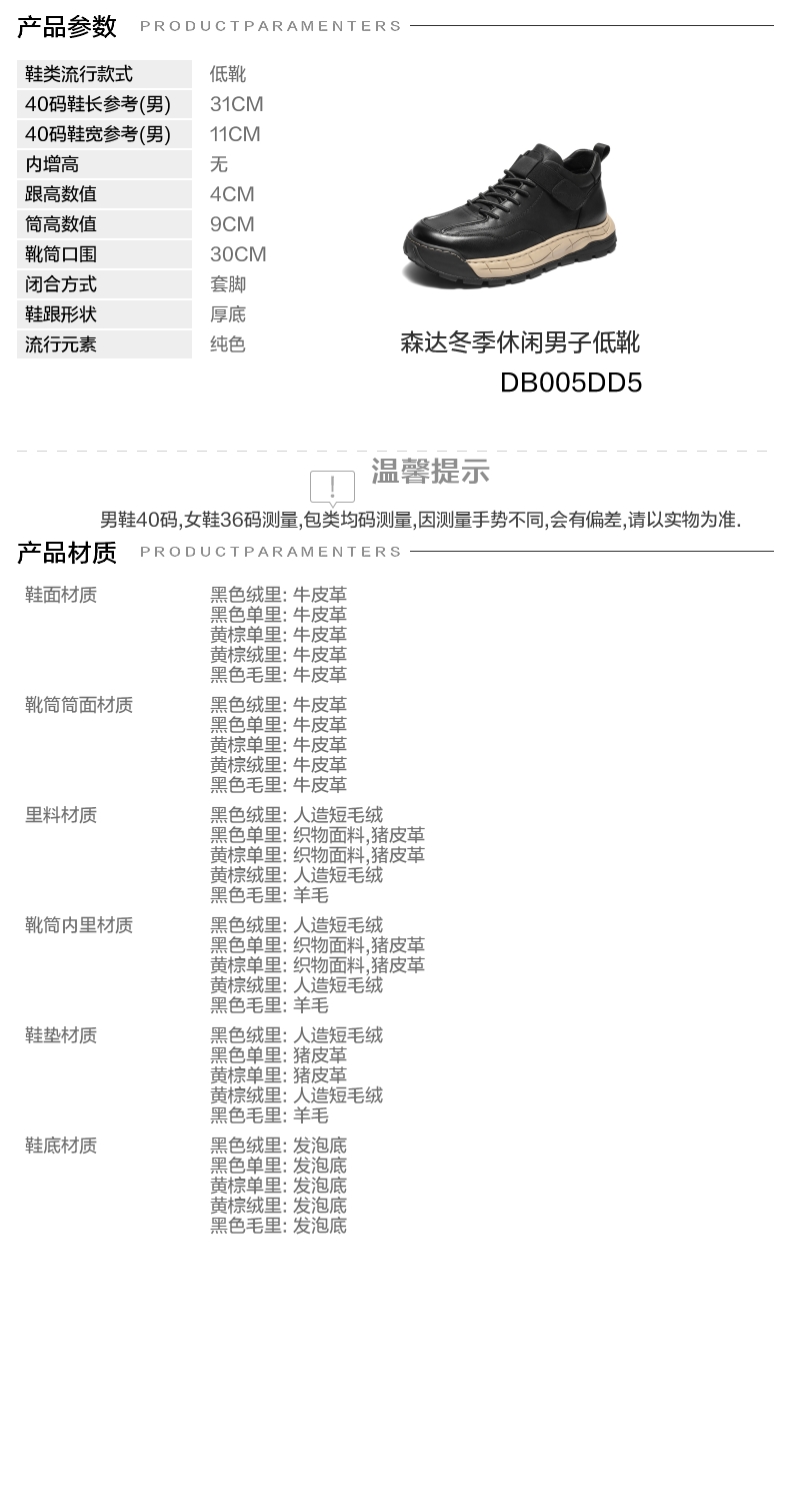 | 闭合方式:套脚 | 40码鞋宽参考(男):11CM | 靴筒口围:30CM | 上市时间:2025年冬季 | 鞋类流行款式:低靴 |