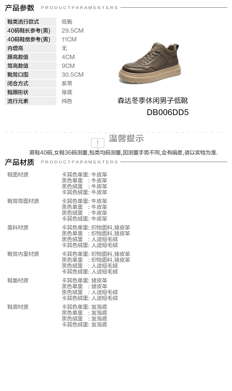 | 闭合方式:系带 | 40码鞋宽参考(男):11CM | 靴筒口围:30.5CM | 上市时间:2025年冬季 | 鞋类流行款式:低靴 |