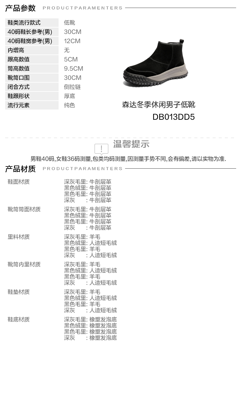 40码鞋长参考(男):30CM 鞋底材质:橡胶发泡 靴筒内里材质:羊毛 内增高:无 鞋面材质:牛剖层革