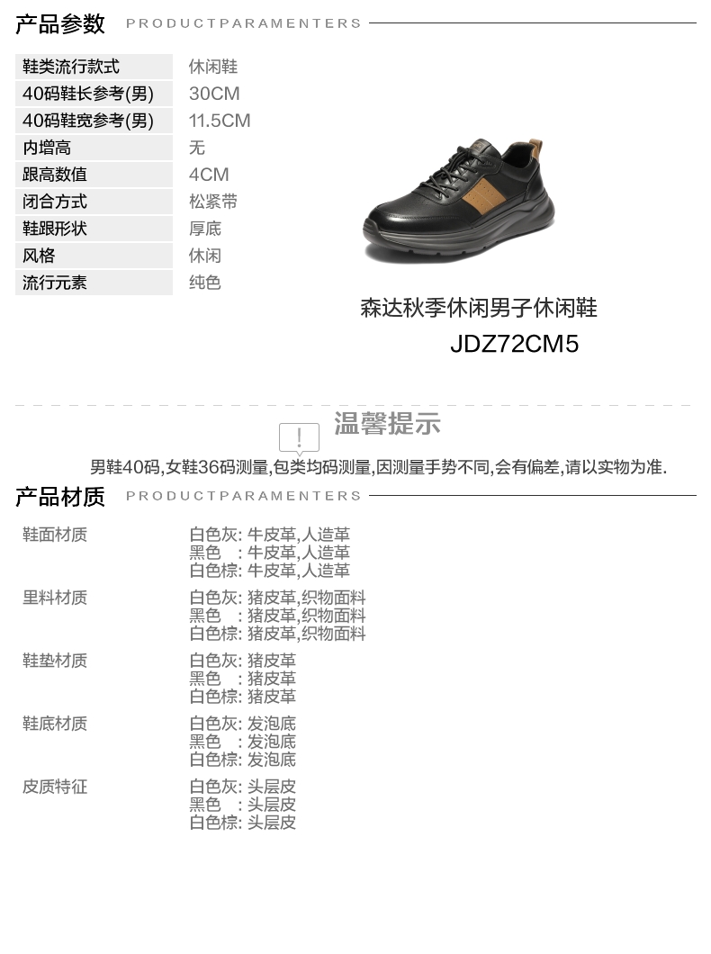 | 风格:休闲 | 色系:黑色 | 跟高数值:4CM | 40码鞋宽参考(男):11.5CM | 性别:男子 |