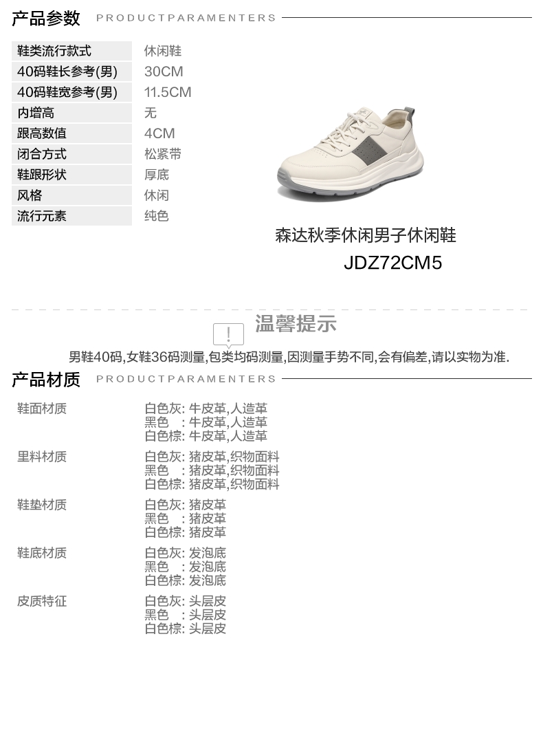 | 风格:休闲 | 色系:白色 | 跟高数值:4CM | 40码鞋宽参考(男):11.5CM | 性别:男子 |