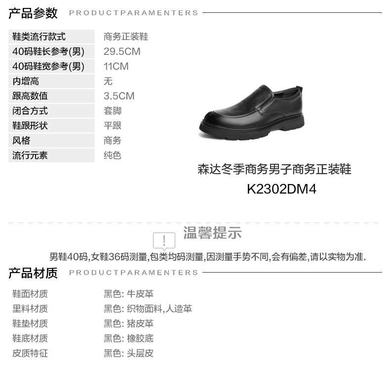 | 风格分类:正装皮鞋 | 上市时间:2024年冬季 | 生产/经销/进口厂家:江苏新森达鞋业有限公司 | 鞋类流行款式:商务正装鞋 | 鞋头款式:圆头 |