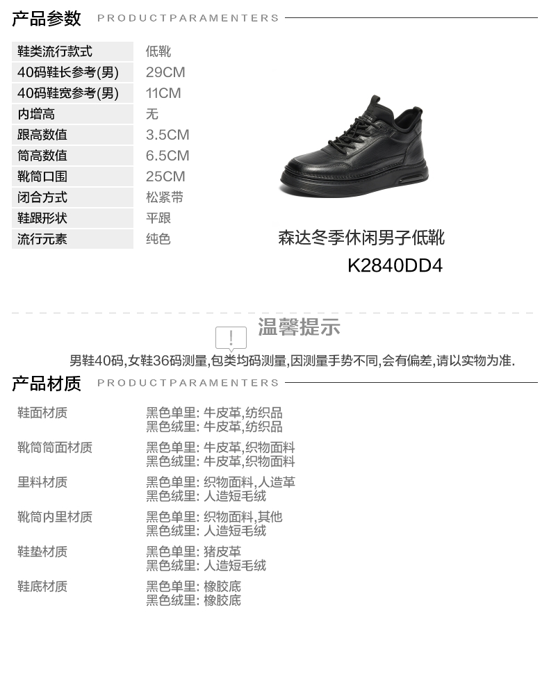 | 闭合方式:松紧带 | 40码鞋宽参考(男):11CM | 靴筒口围:25CM | 上市时间:2024年冬季 | 鞋类流行款式:低靴 |