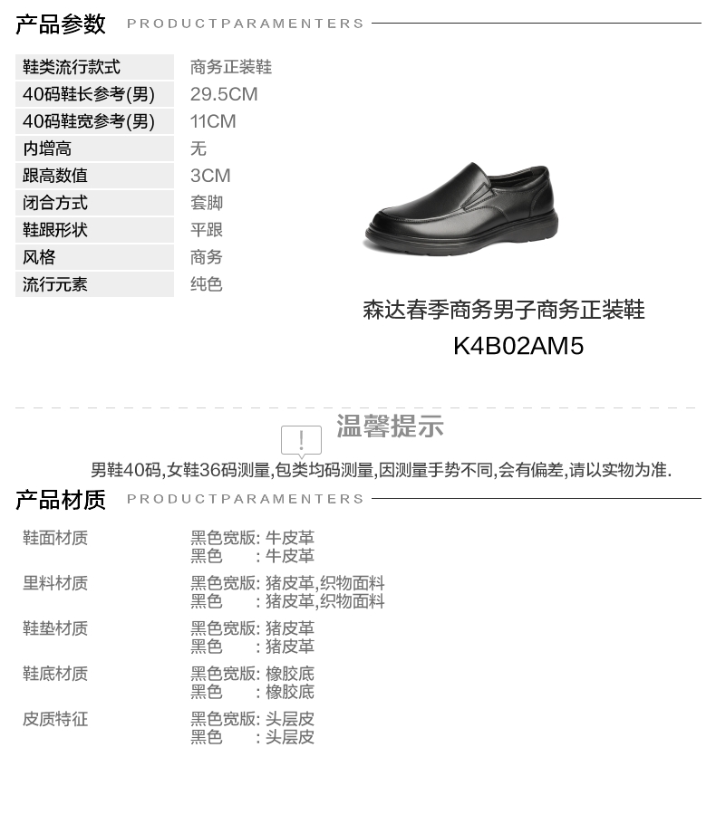 | 风格分类:正装皮鞋 | 上市时间:2025年春季 | 生产/经销/进口厂家:江苏新森达鞋业有限公司 | 鞋类流行款式:商务正装鞋 | 鞋头款式:圆头 |