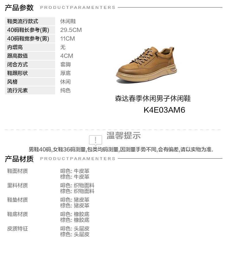 | 风格:休闲 | 色系:棕色 | 跟高数值:4CM | 40码鞋宽参考(男):11CM | 性别:男子 |
