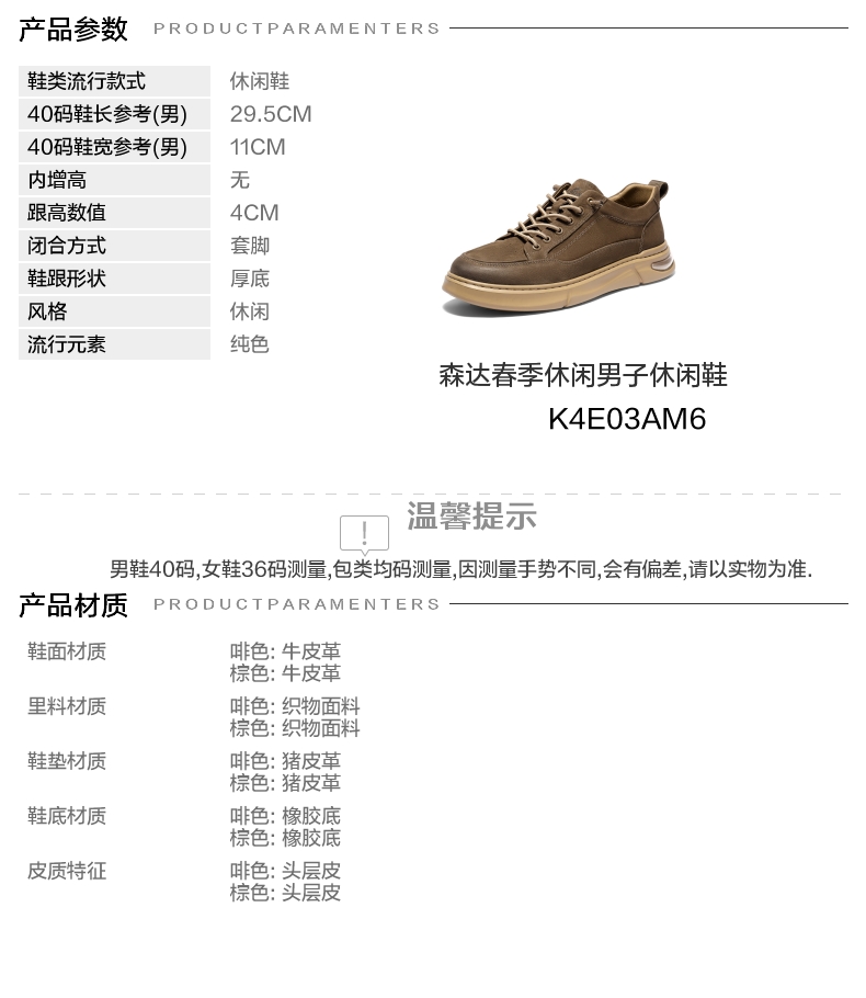 | 风格:休闲 | 色系:咖啡色 | 跟高数值:4CM | 40码鞋宽参考(男):11CM | 性别:男子 |