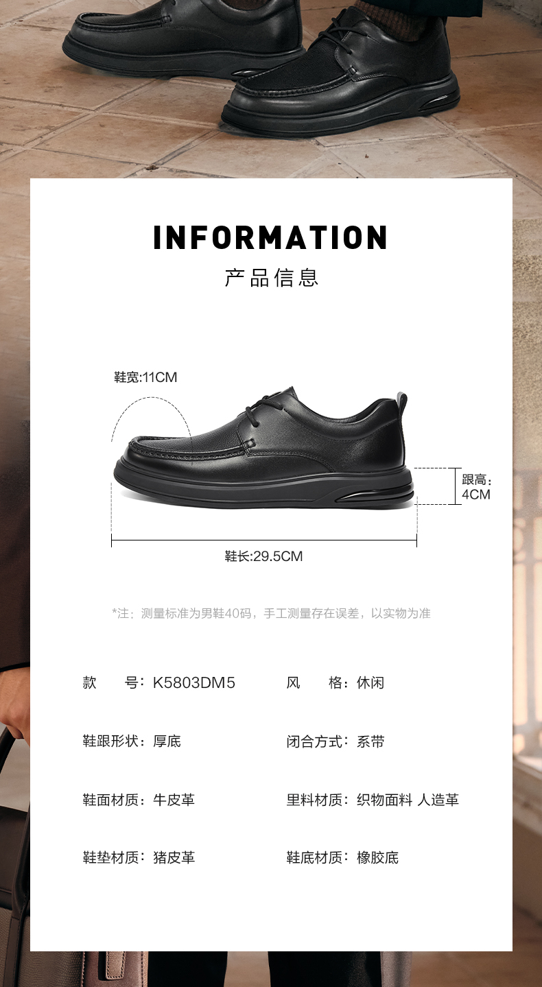 | 风格:休闲 | 色系:黑色 | 跟高数值:4CM | 40码鞋宽参考(男):11CM | 性别:男子 |