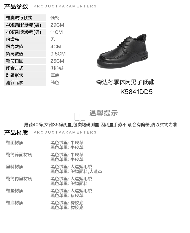 | 闭合方式:侧拉链 | 40码鞋宽参考(男):11CM | 靴筒口围:26CM | 上市时间:2025年冬季 | 鞋类流行款式:低靴 |