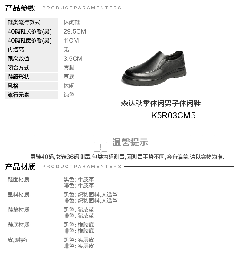 | 风格:休闲 | 色系:黑色 | 跟高数值:3.5CM | 40码鞋宽参考(男):11CM | 性别:男子 |