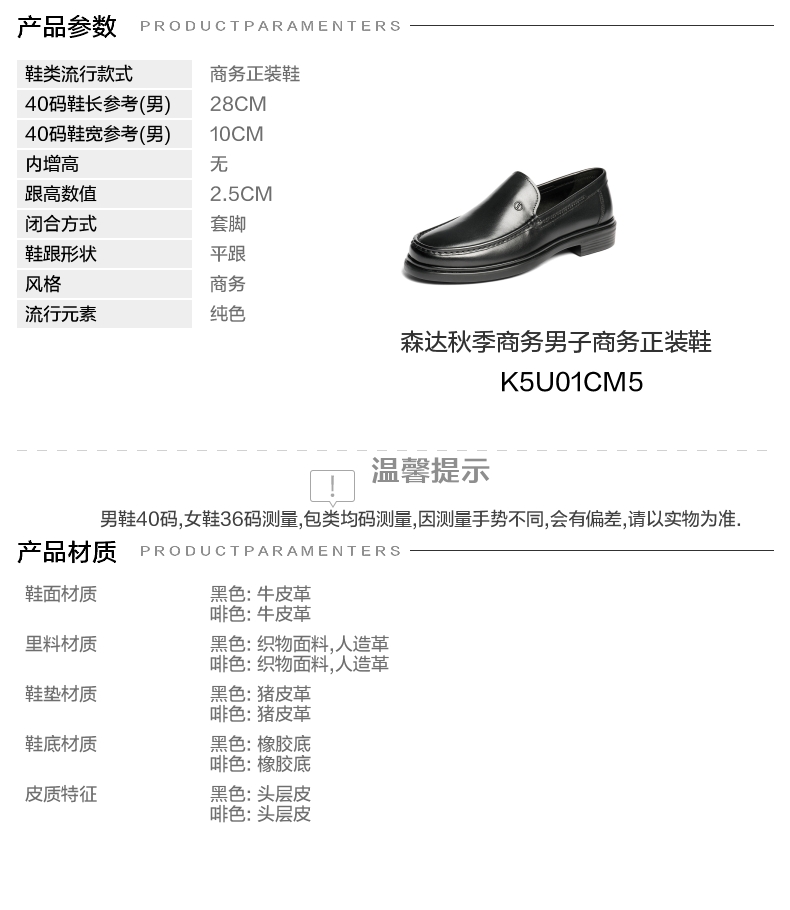 | 风格:商务 | 色系:黑色 | 跟高数值:2.5CM | 40码鞋宽参考(男):10CM | 性别:男子 |