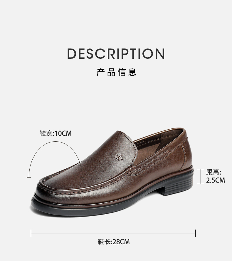 | 风格:商务 | 色系:棕色 | 跟高数值:2.5CM | 40码鞋宽参考(男):10CM | 性别:男子 |