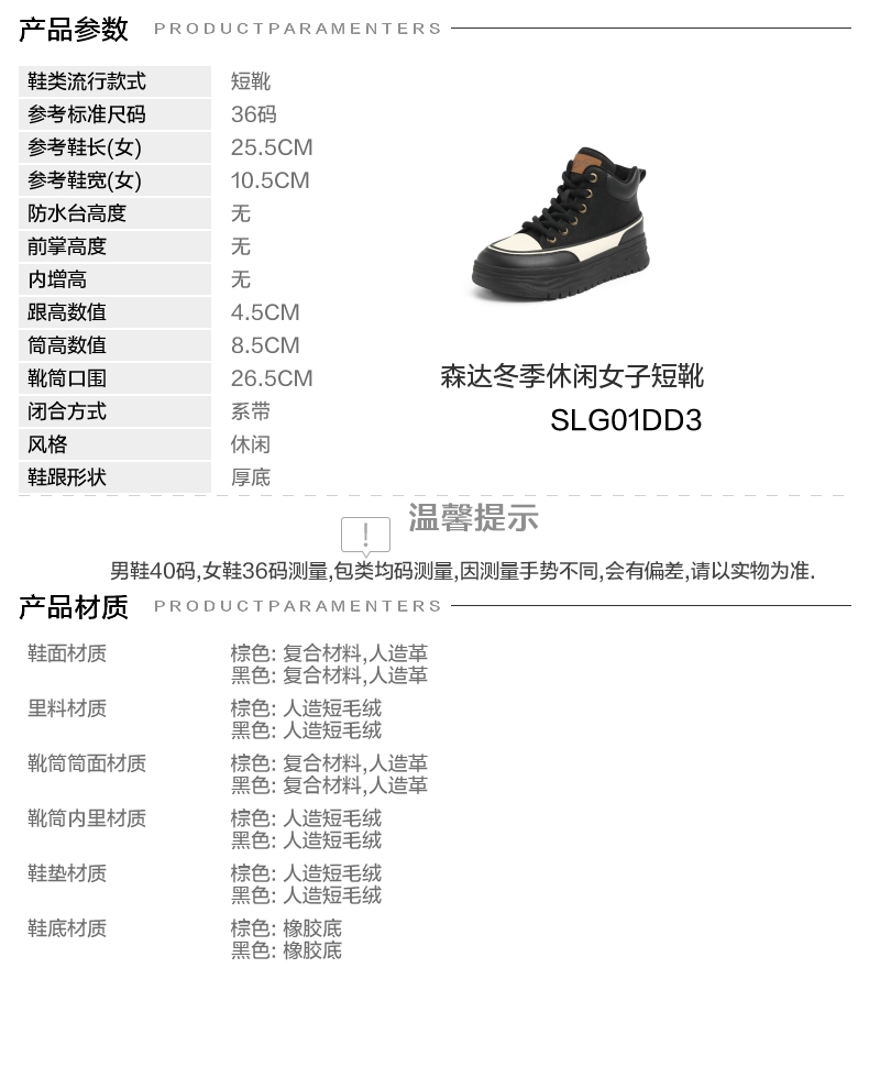 | 鞋底材质:橡胶底 | 靴筒内里材质:人造短毛绒 | 内增高:无 | 鞋面材质:复合材料人造革 | 闭合方式:系带 |