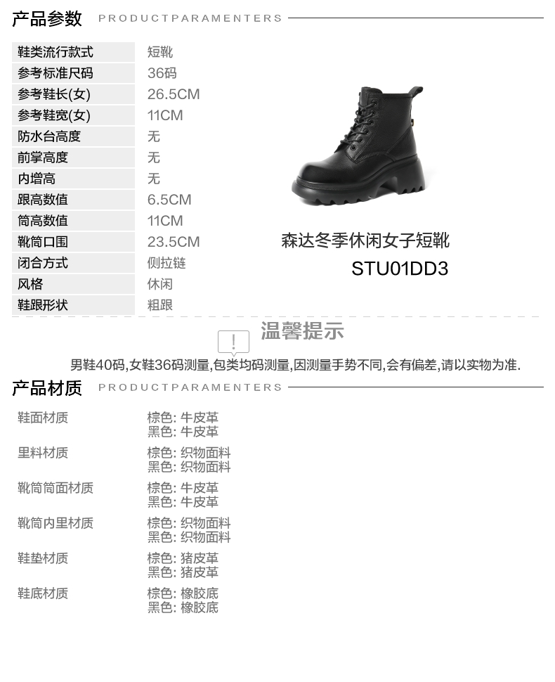 | 参考鞋宽(女):11CM | 风格:休闲 | 色系:黑色 | 跟高数值:6.5CM | 筒高数值:11CM |