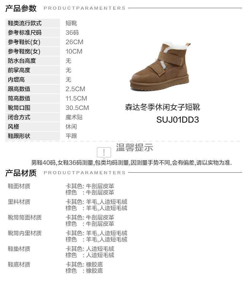 | 鞋底材质:橡胶底 | 靴筒内里材质:人造短毛绒羊毛 | 内增高:无 | 鞋面材质:牛剖层皮革 | 闭合方式:魔术贴 |