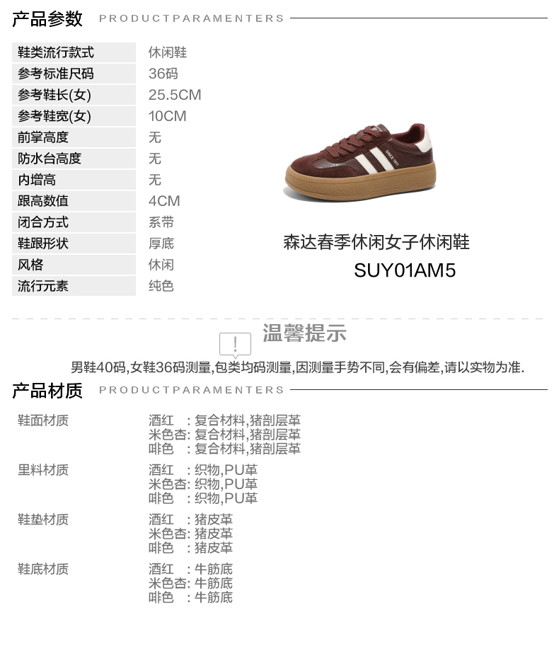 | 参考鞋长(女):25.5CM | 参考鞋宽(女):10CM | 风格:休闲 | 色系:啡色 | 参考标准尺码:36码 |