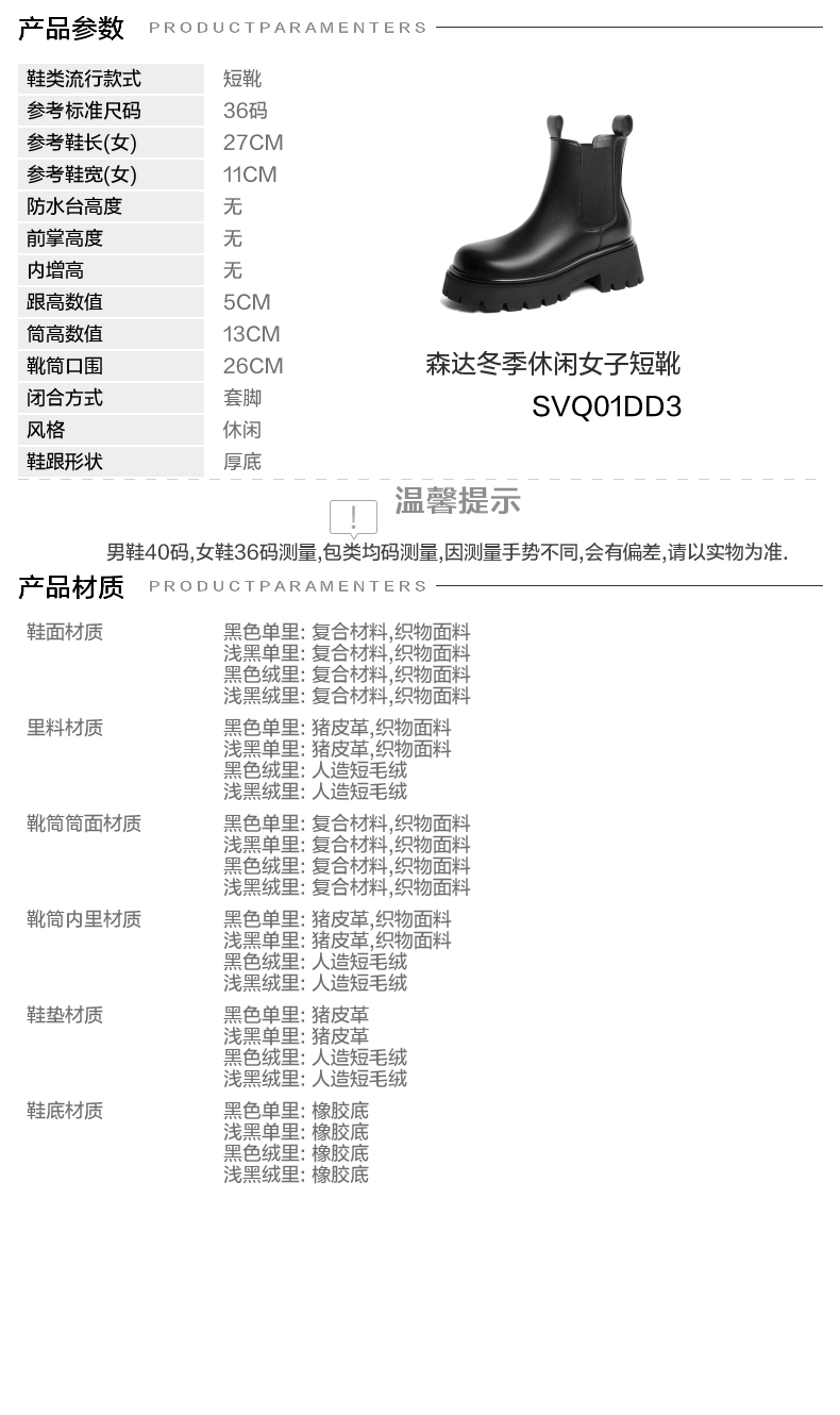 | 参考鞋宽(女):11CM | 风格:休闲 | 色系:黑色 | 跟高数值:5CM | 筒高数值:13CM |