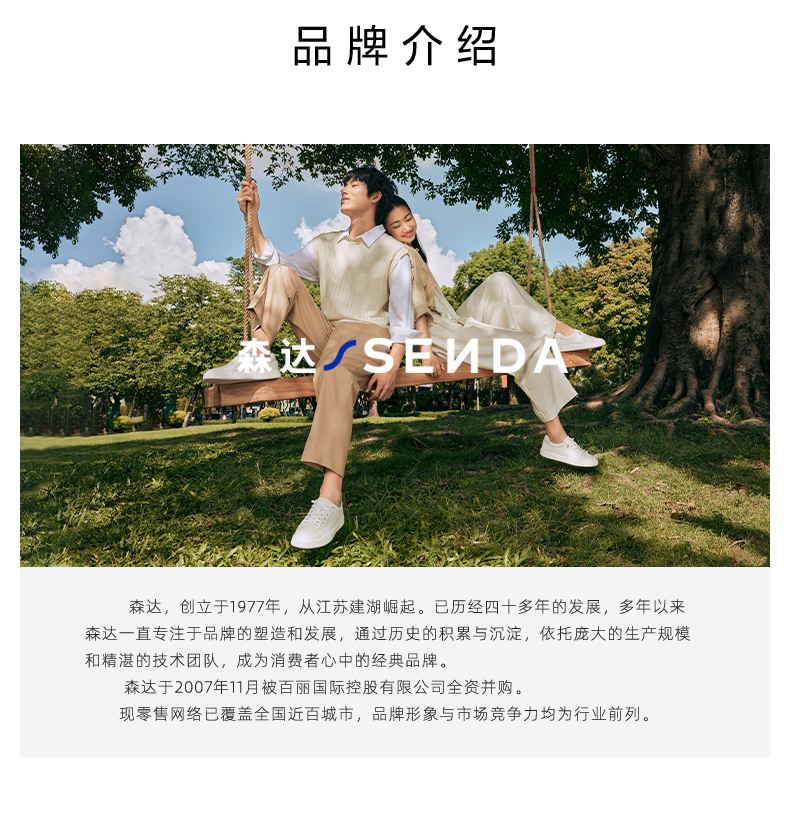 SENDA(森达),品牌成立于1977年,拥有40年发展史,秉承舒适的制鞋理念,从用料到工艺都经过严格质量把控。男鞋以舒适质感著称,覆盖商务正装、商务休闲、时尚休闲三大系列,适用不同场合的需求,同时开发摩克、加州等一系列功能性鞋履,行走体验;女鞋以款式优雅、穿着舒适为主要特征,依时尚潮流添加当季设计元素,每季推出时尚、休闲等系列鞋款,为都市白领提供不同场合的搭配需求。目前门店已覆盖近百座城市,数量达1800多家。