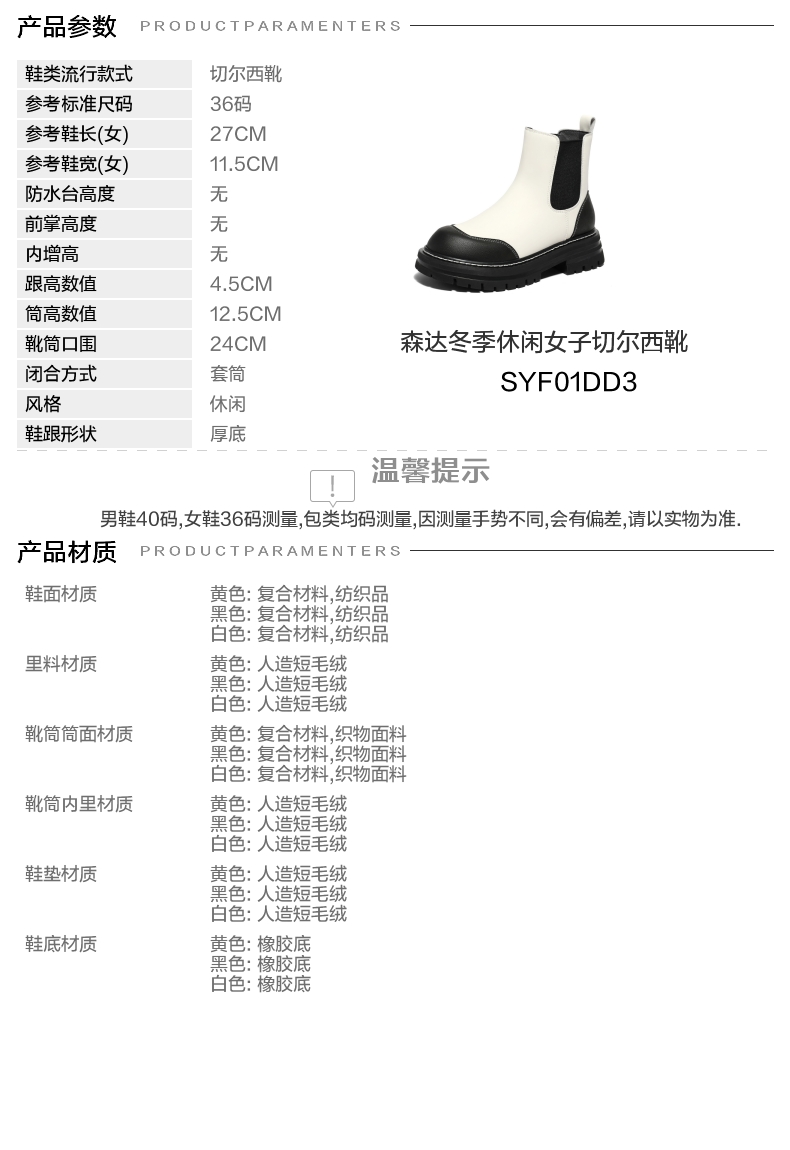 | 帮面材质:织物复合材料 | 配跟:无 | 靴筒口围:24CM | 上市时间:2023年冬季 | 鞋类流行款式:切尔西靴 |