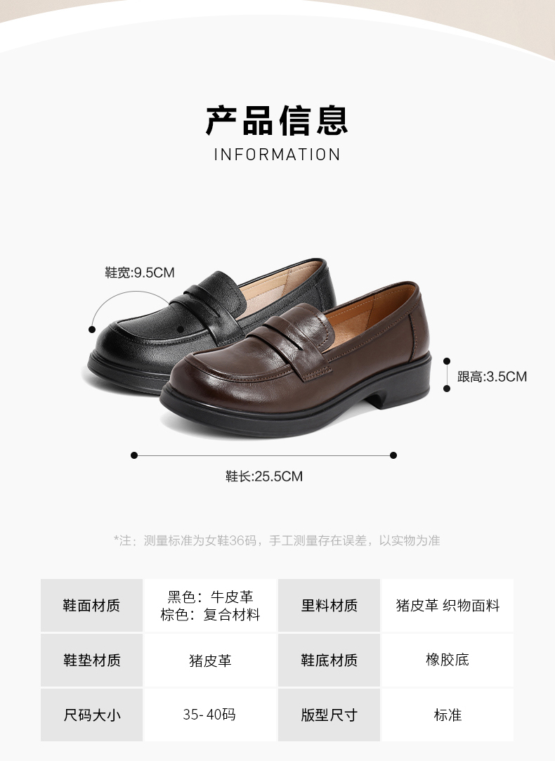 | 跟高数值:3.5CM | 性别:女子 | 里料材质:织物超纤猪皮革 | 制鞋工艺:胶贴皮鞋 | 款式季节:春季 |