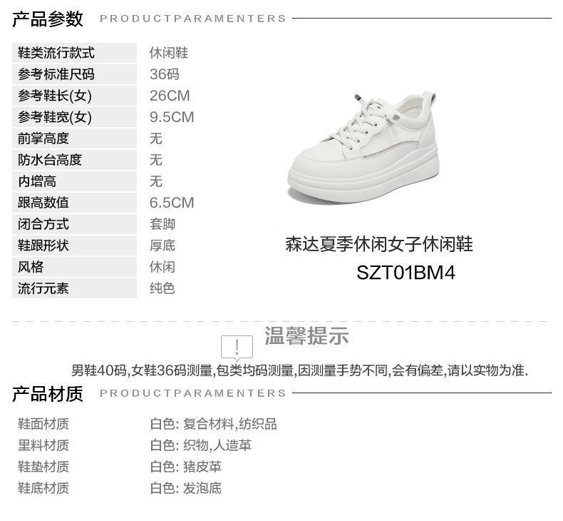 | 色系:白色 | 跟高数值:6.5CM | 性别:女子 | 里料材质:织物人造革 | 制鞋工艺:胶贴皮鞋 |