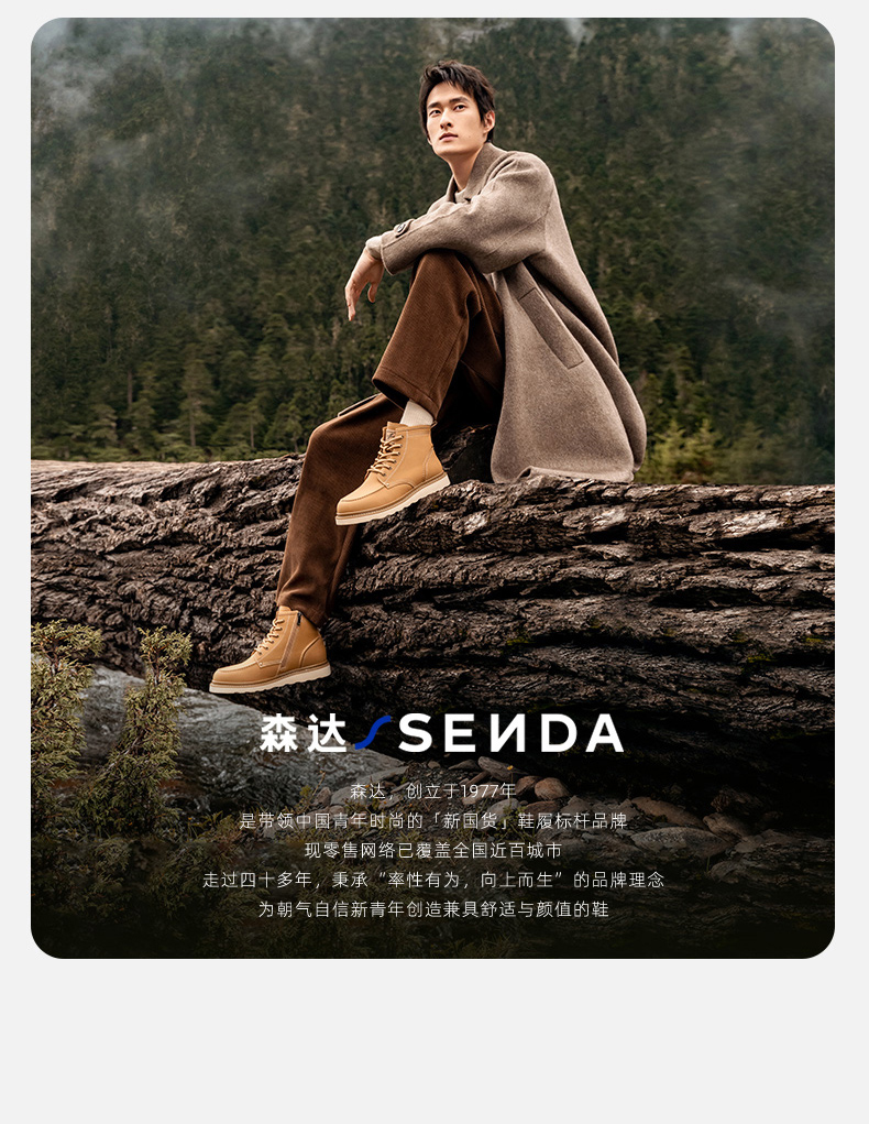SENDA(森达),品牌成立于1977年,拥有40年发展史,秉承舒适的制鞋理念,从用料到工艺都经过严格质量把控。男鞋以舒适质感著称,覆盖商务正装、商务休闲、时尚休闲三大系列,适用不同场合的需求,同时开发摩克、加州等一系列功能性鞋履,行走体验;女鞋以款式优雅、穿着舒适为主要特征,依时尚潮流添加当季设计元素,每季推出时尚、休闲等系列鞋款,为都市白领提供不同场合的搭配需求。目前门店已覆盖近百座城市,数量达1800多家。