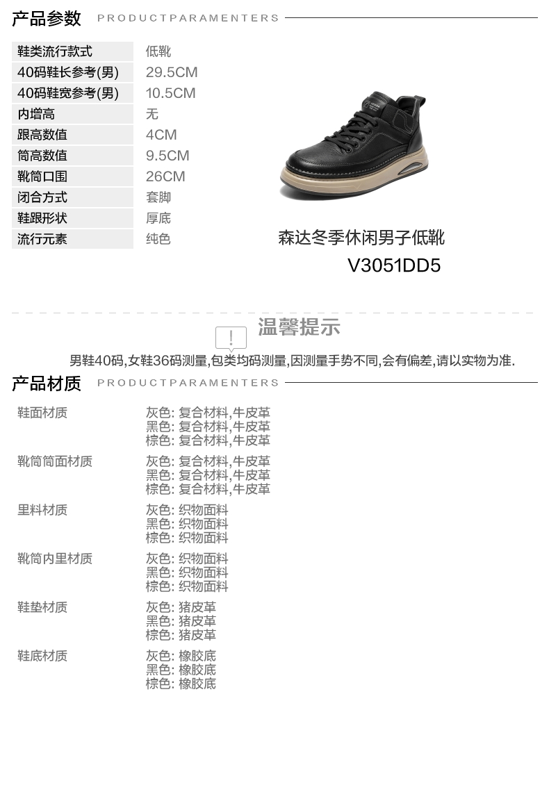 | 闭合方式:套脚 | 40码鞋宽参考(男):10.5CM | 靴筒口围:26CM | 上市时间:2025年冬季 | 鞋类流行款式:低靴 |