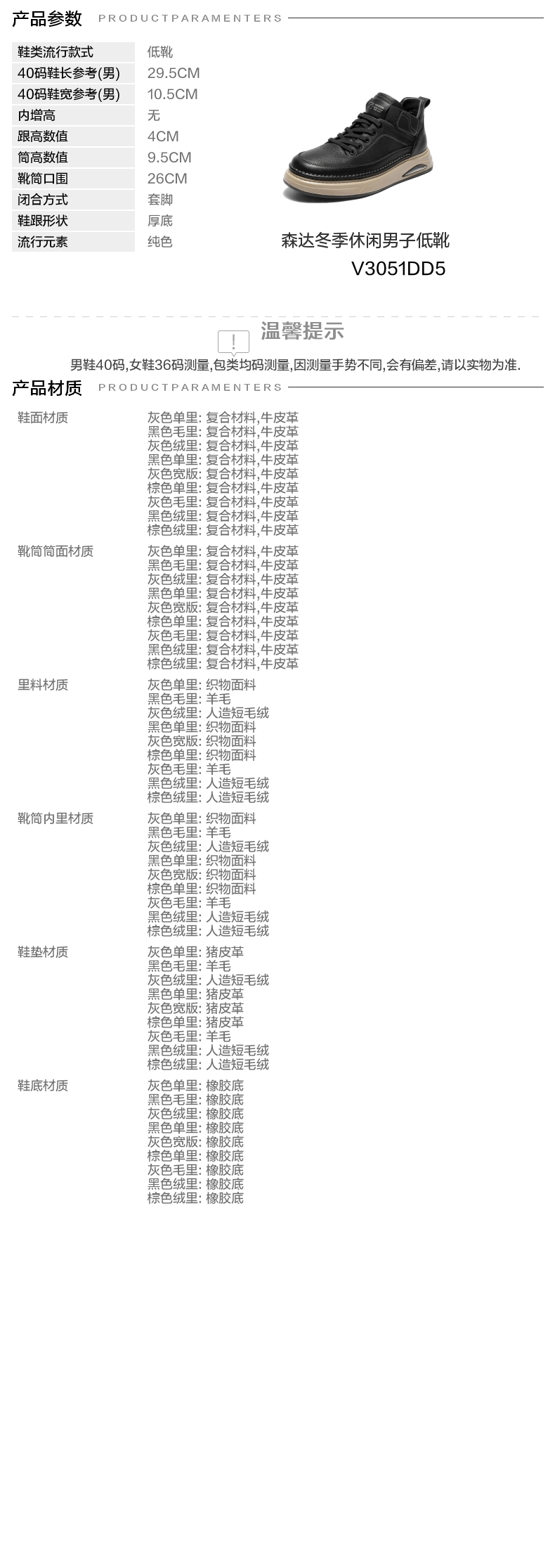 | 闭合方式:套脚 | 40码鞋宽参考(男):10.5CM | 靴筒口围:26CM | 上市时间:2025年冬季 | 鞋类流行款式:低靴 |