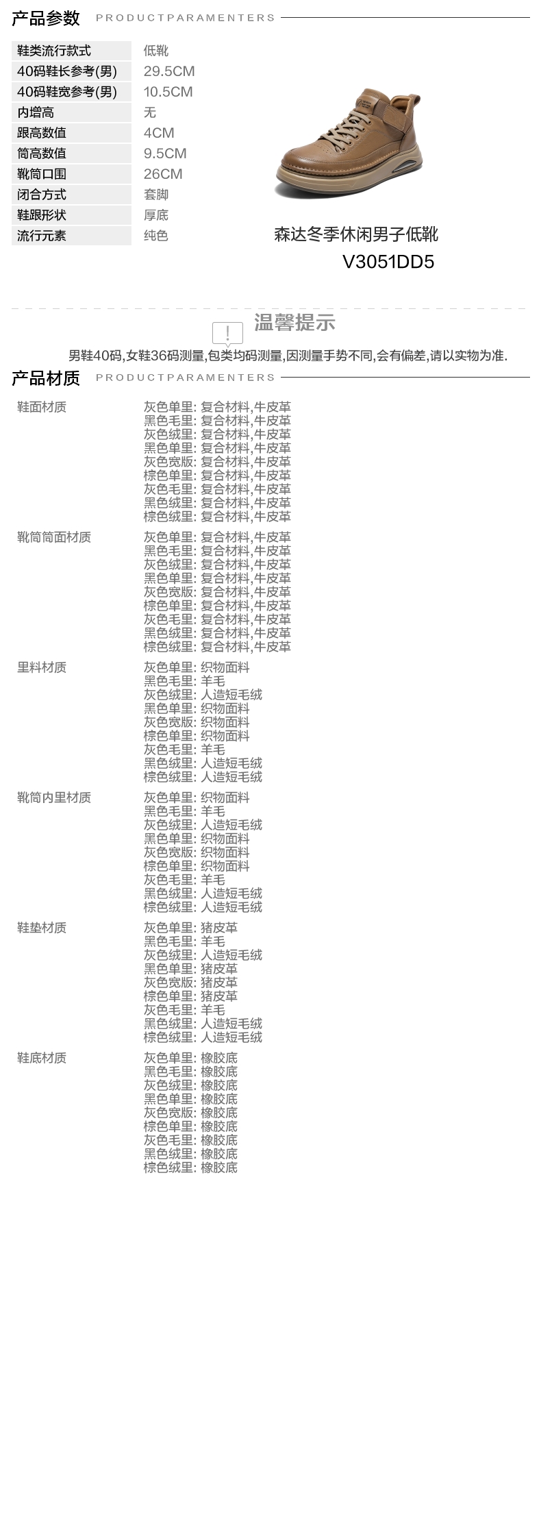 | 闭合方式:套脚 | 40码鞋宽参考(男):10.5CM | 靴筒口围:26CM | 上市时间:2025年冬季 | 鞋类流行款式:低靴 |