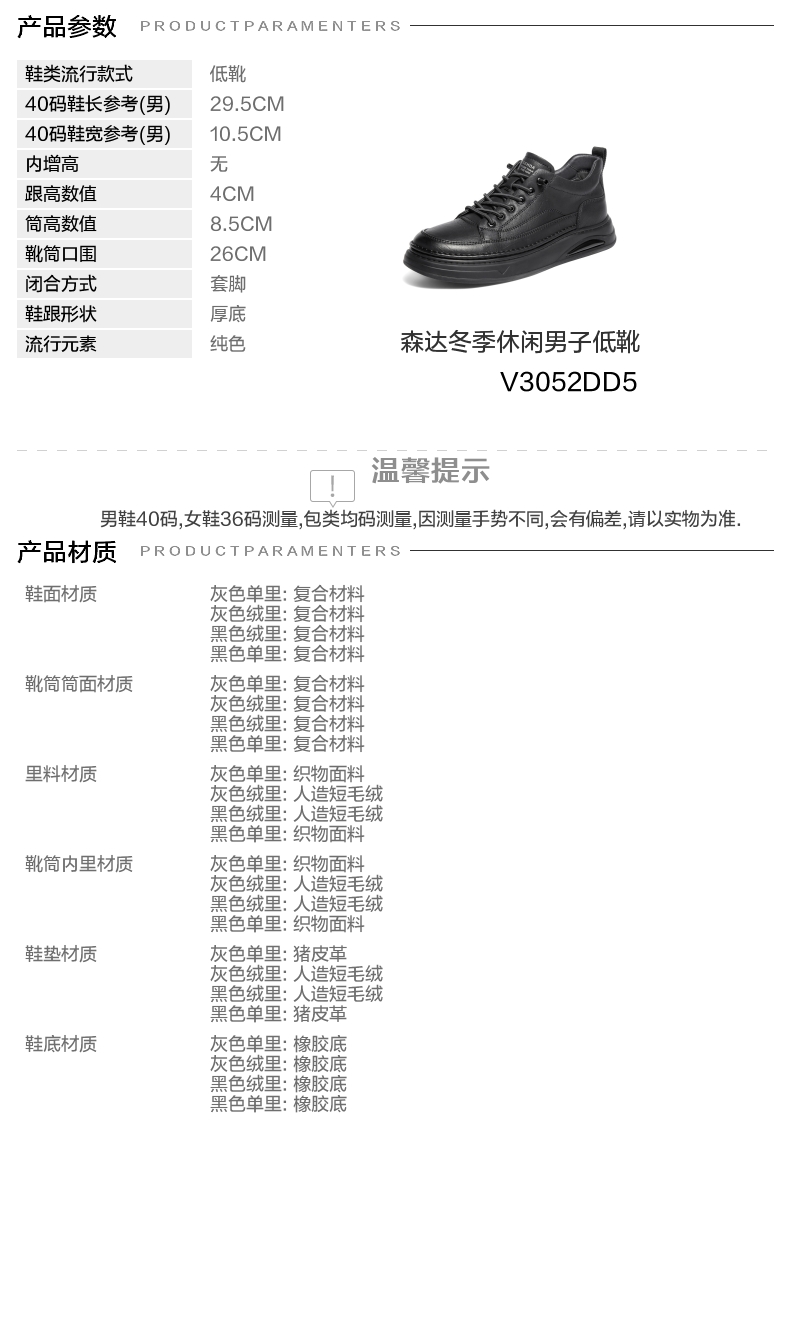 | 闭合方式:套脚 | 40码鞋宽参考(男):10.5CM | 靴筒口围:26CM | 上市时间:2025年冬季 | 鞋类流行款式:低靴 |