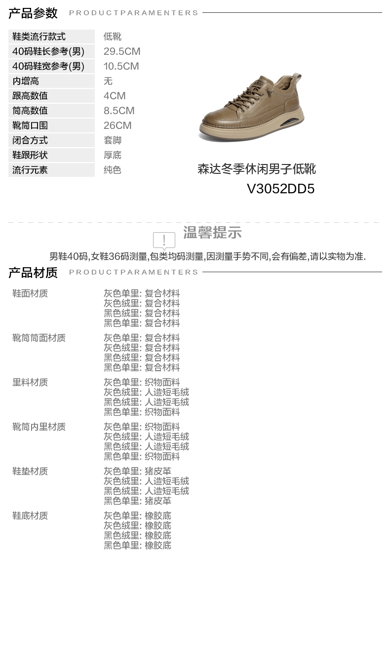 | 闭合方式:套脚 | 40码鞋宽参考(男):10.5CM | 靴筒口围:26CM | 上市时间:2025年冬季 | 鞋类流行款式:低靴 |