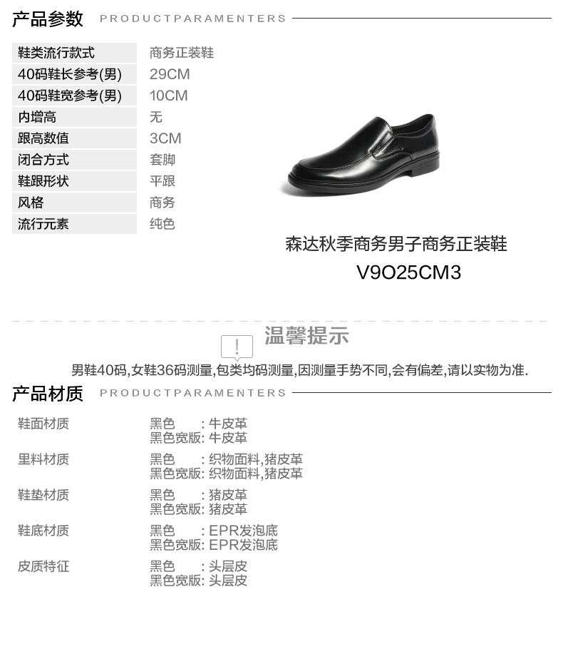| 适用场合:正装 | 闭合方式:套脚 | 风格:商务 | 跟高数值:3CM | 色系:黑色 |