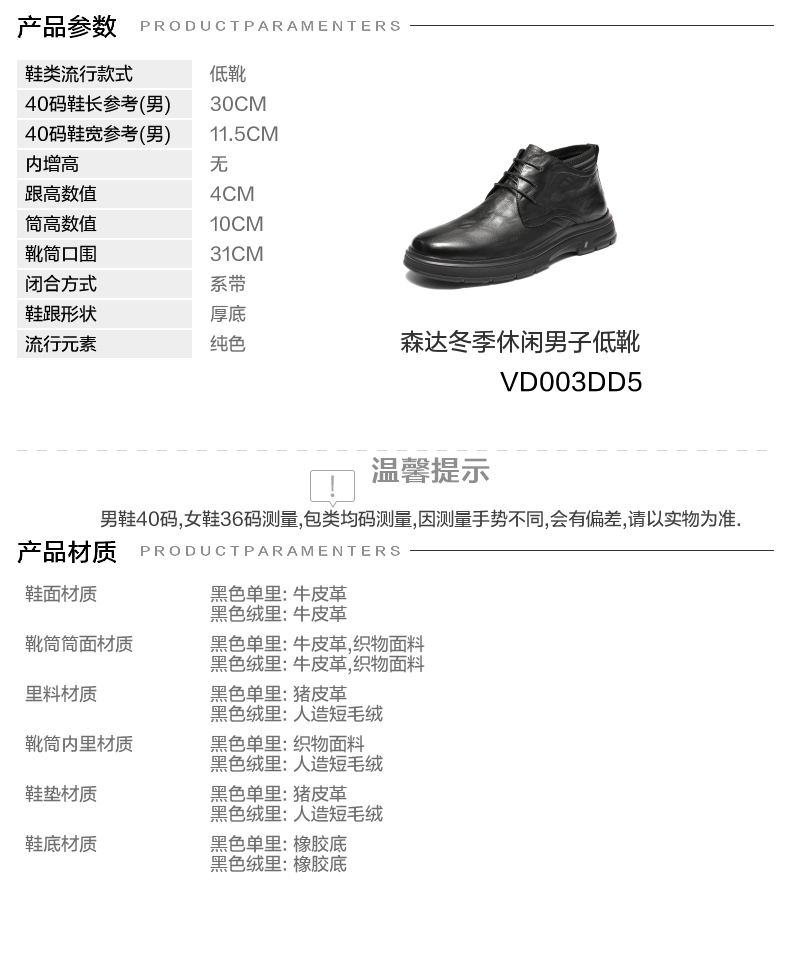 | 闭合方式:系带 | 40码鞋宽参考(男):11.5CM | 靴筒口围:31CM | 上市时间:2025年冬季 | 鞋类流行款式:低靴 |