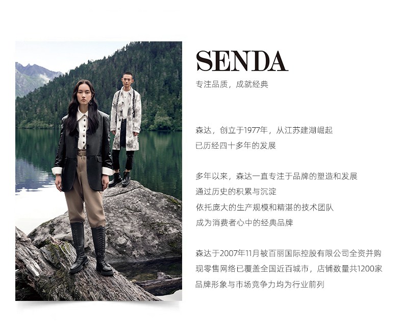 SENDA(森达),品牌成立于1977年,拥有40年发展史,秉承舒适的制鞋理念,从用料到工艺都经过严格质量把控。男鞋以舒适质感著称,覆盖商务正装、商务休闲、时尚休闲三大系列,适用不同场合的需求,同时开发摩克、加州等一系列功能性鞋履,行走体验;女鞋以款式优雅、穿着舒适为主要特征,依时尚潮流添加当季设计元素,每季推出时尚、休闲等系列鞋款,为都市白领提供不同场合的搭配需求。目前门店已覆盖近百座城市,数量达1800多家。