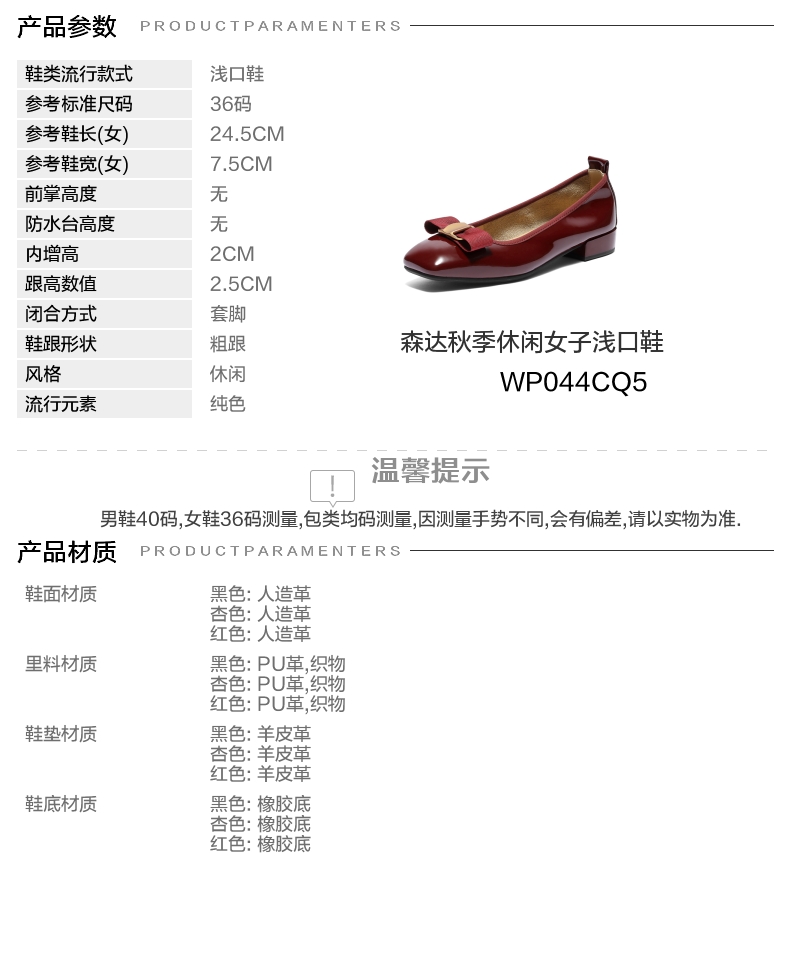 | 皮质特征:人造革 | 前掌高度:无 | 防水台高度:无 | 鞋类流行款式:浅口鞋 |