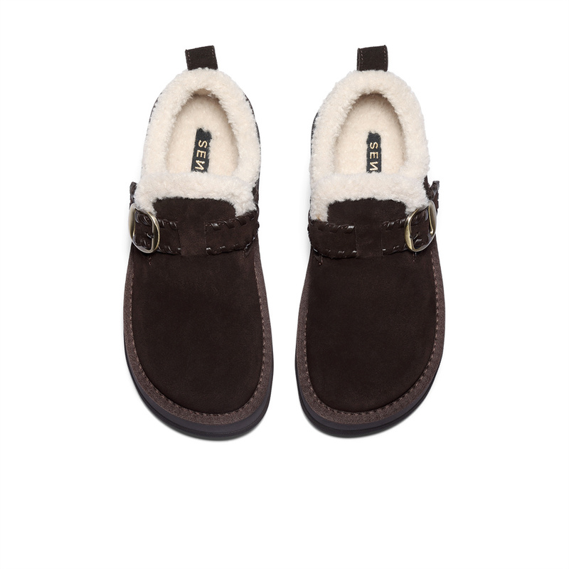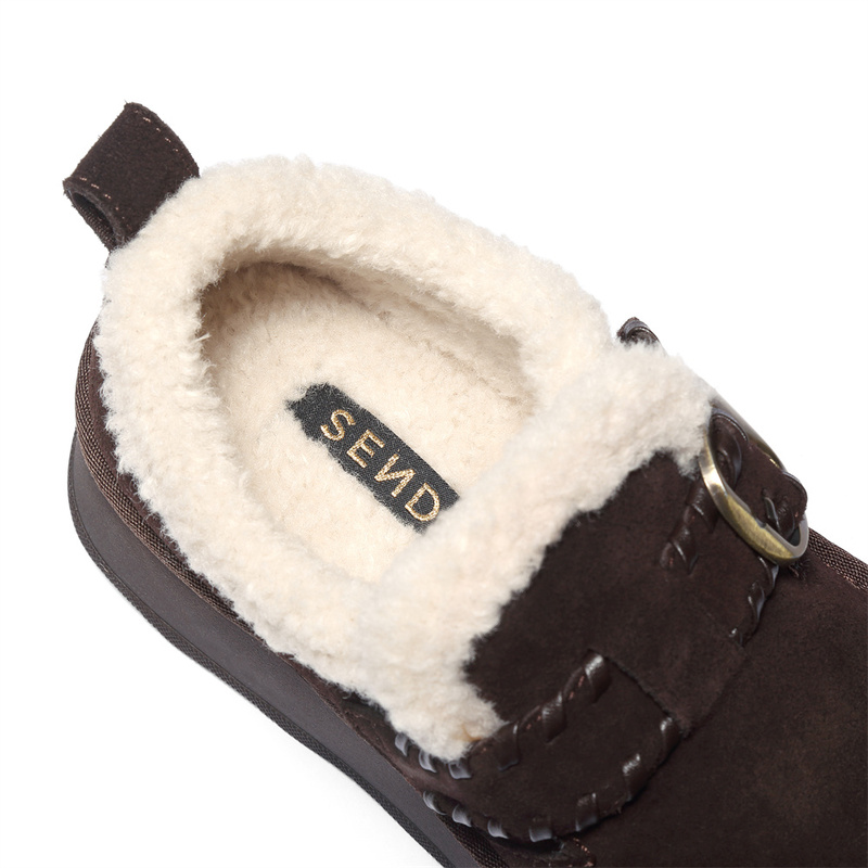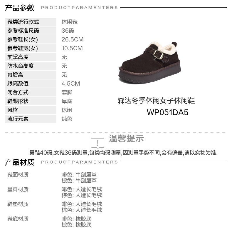| 色系:咖啡色 | 跟高数值:4.5CM | 性别:女子 | 里料材质:人造长毛绒 | 制鞋工艺:胶贴皮鞋 |