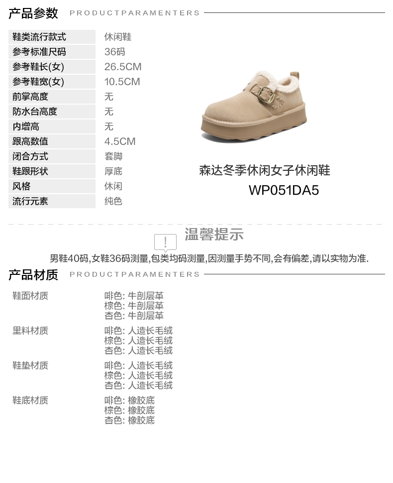 | 色系:杏色 | 跟高数值:4.5CM | 性别:女子 | 里料材质:人造长毛绒 | 制鞋工艺:胶贴皮鞋 |