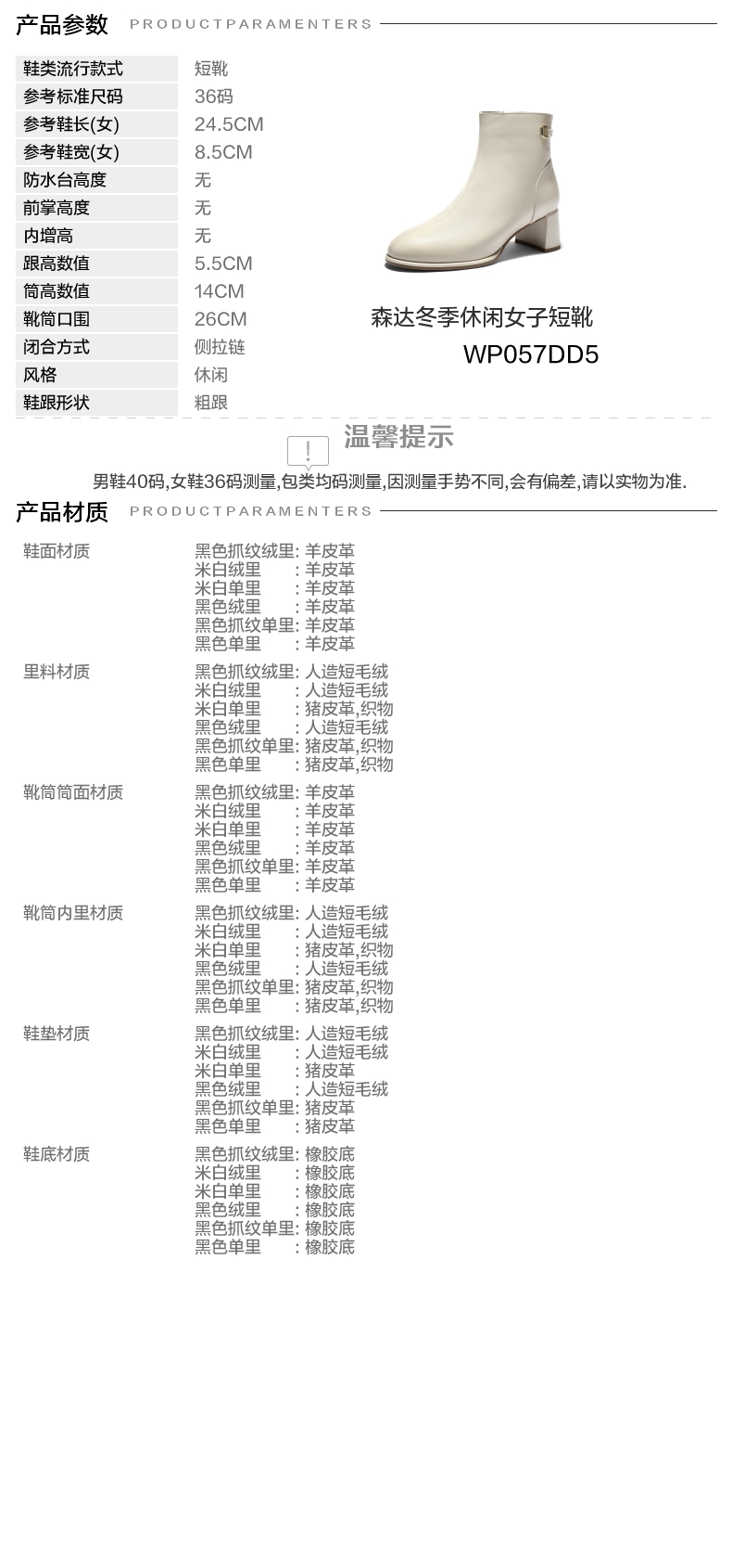 | 鞋底材质:橡胶底 | 靴筒内里材质:织物猪皮革 | 内增高:无 | 鞋面材质:羊皮革 | 闭合方式:侧拉链 |