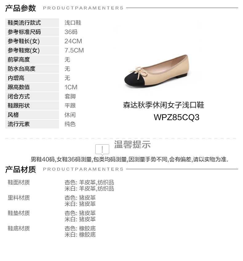| 参考鞋宽(女):7.5CM | 风格:休闲 | 色系:杏色 | 参考标准尺码:36码 | 跟高数值:1CM |