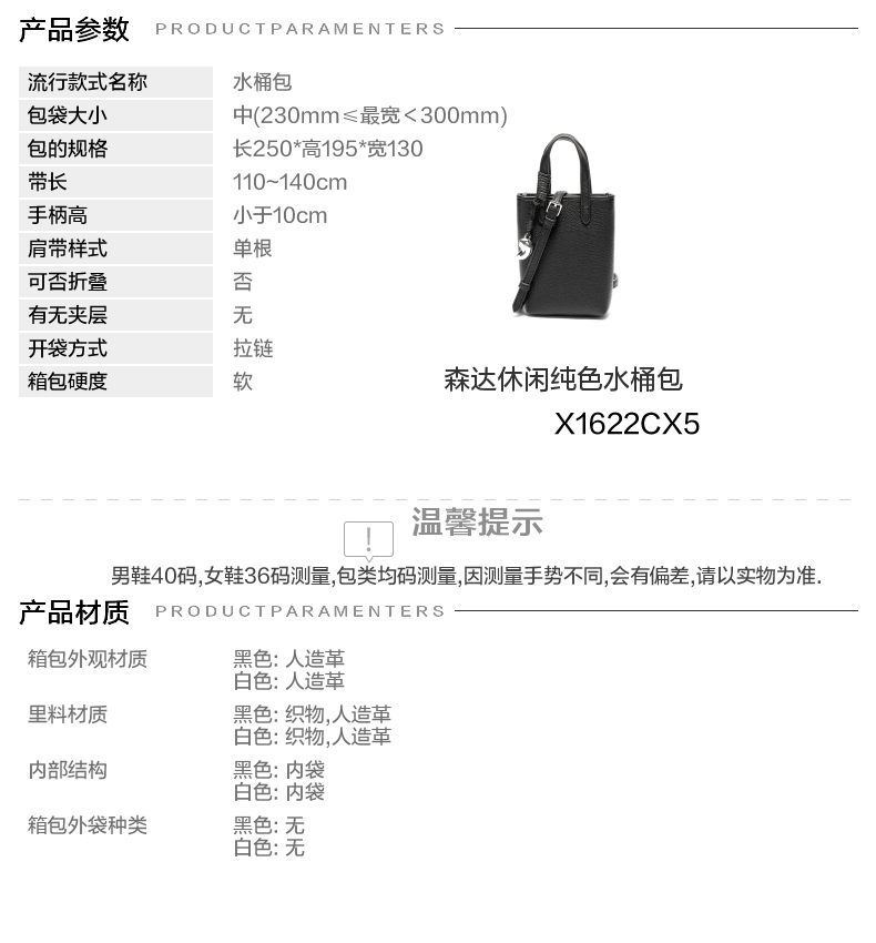 | 款式季节:秋季 | 材质工艺:其他 | 皮质特征:人造革 | 箱包硬度:软 | 箱包外观材质:人造革 |