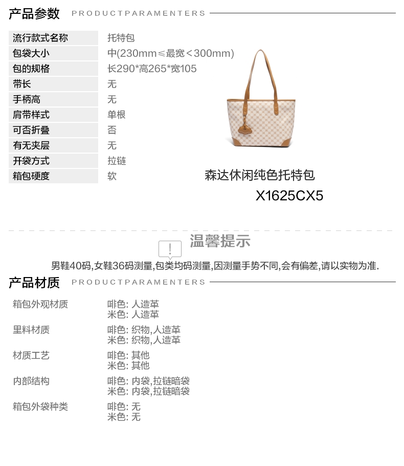 | 色系:米色 | 适用场景:日常 | 开袋方式:拉链 | 性别:女子 | 是否防水:否 |
