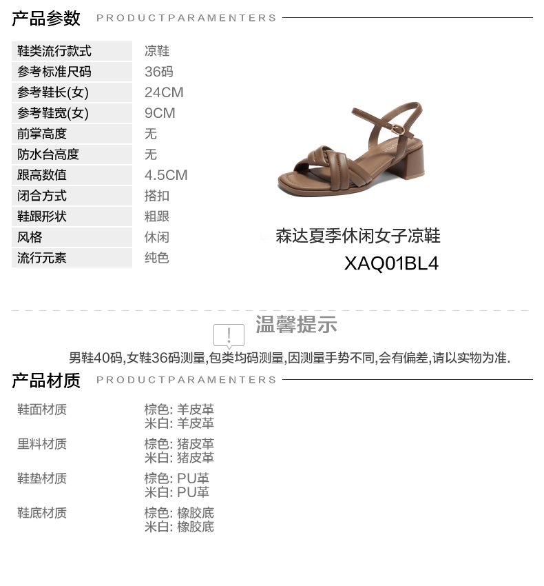 | 鞋头款式:露趾 | 执行标准:皮凉鞋GB/T22756-2017 | 跟高范围:中跟鞋(3-5CM) | 鞋面图案:纯色 | 鞋跟形状:粗跟 |