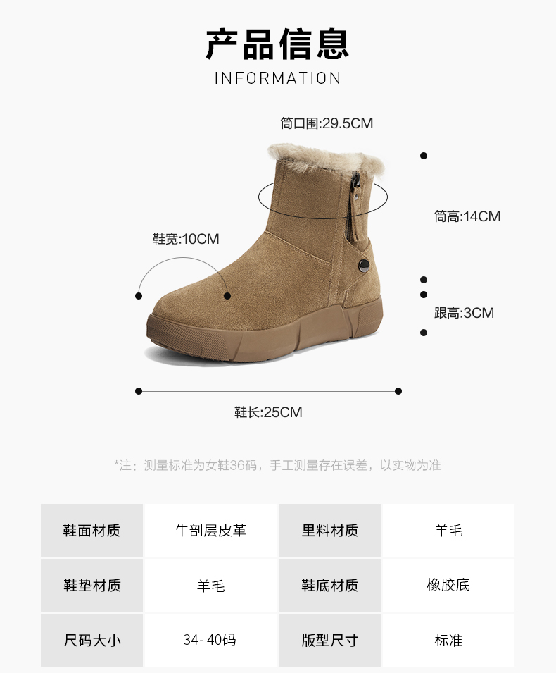 | 帮面材质:牛剖层革 | 配跟:无 | 靴筒口围:29.5CM | 上市时间:2024年冬季 | 鞋类流行款式:短靴 |