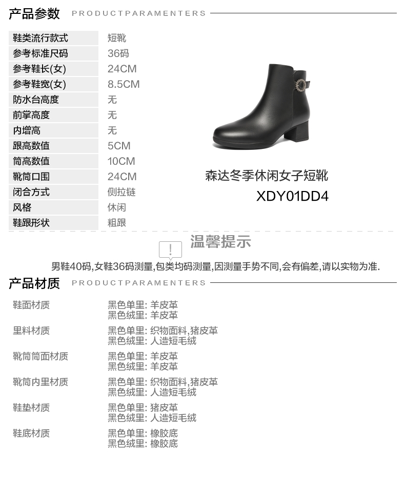 | 参考鞋宽(女):8.5CM | 风格:休闲 | 色系:黑色 | 跟高数值:5CM | 筒高数值:10CM |
