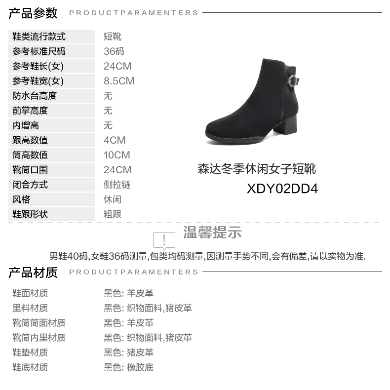 | 靴筒口围:24CM | 风格分类:时装靴 | 上市时间:2024年冬季 | 生产/经销/进口厂家:江苏新森达鞋业有限公司 | 鞋类流行款式:短靴 |